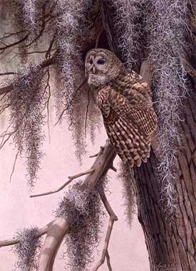 The artist notes: ”I always loved Barred Owls because they are so ease to call and see and they are very approachable. Most that I have seen have been in wet areas. If you want to see one, give a "Who who ha hooo, who who ha hooooo-ah." If they are around--especially in the evening or at night--you should get a response. The neat thing is that they will actually fly to the source of the hoot."
