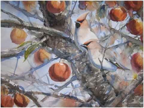 500-1,000 birds feeding on fruit and berries. Elfman continues: "The Waxwing is for me a favorite bird, both in the garden and in my paintings. . . . [It] has unique plumage. Soft pink, grey and brown colours contrast with intense black, yellow, red and white. It´s a stocky bird with a prominent crest...The call is a trilling and high-pitched, like small silver bells!"