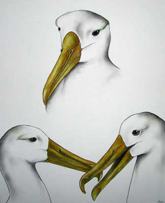 The artist noted that the Waved Albatross is a symbol of the Galapagos, where probably fewer than 3,000 pair breed on Española (Hood) Island, its only known breeding site. Española is part of the Galápagos National Park and Marine Reserve. A small number (10-to-20 pairs) might also breed on Isla de la Plata off Ecuador's Manabí province, but population data is sketchy. If researchers do find breeding pairs there, they will be at risk to nest-predation by rats and cats and to illegal collection of eggs and young.