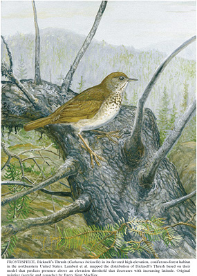 The frontispiece the Wilson Bulletin (Vol. 117, No. 1, March, 2005) by Registry participant Barry Kent MacKay features Bicknell's Thrush (Catharus bicknelli) in northeastern United States. |