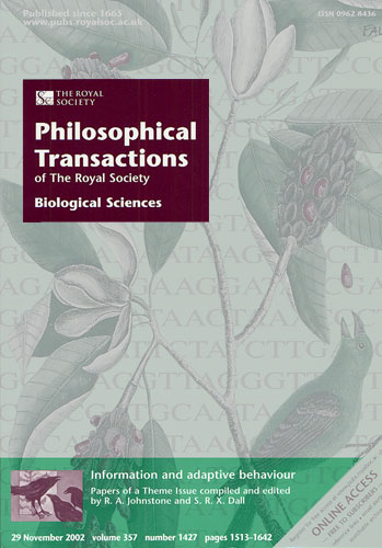 The cover of the Journal of Philosophical Transactions of the Royal Society of London: Biological Sciences (29 November 2002, vol. 357, no. 1427) included a small shot of a painting by Judith Smith. The accompanying caption read: a crow shares important information with the other members of a night-time roost in a Douglas fir forest. ('Nightline' by Judith G. Smith; http://artshow.com/apow/smith.) |