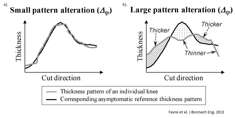 - Thickness pattern alterations increased (i.e. difference relative to the typical healthy thickness pattern becomes bigger) with increasing OA severity.