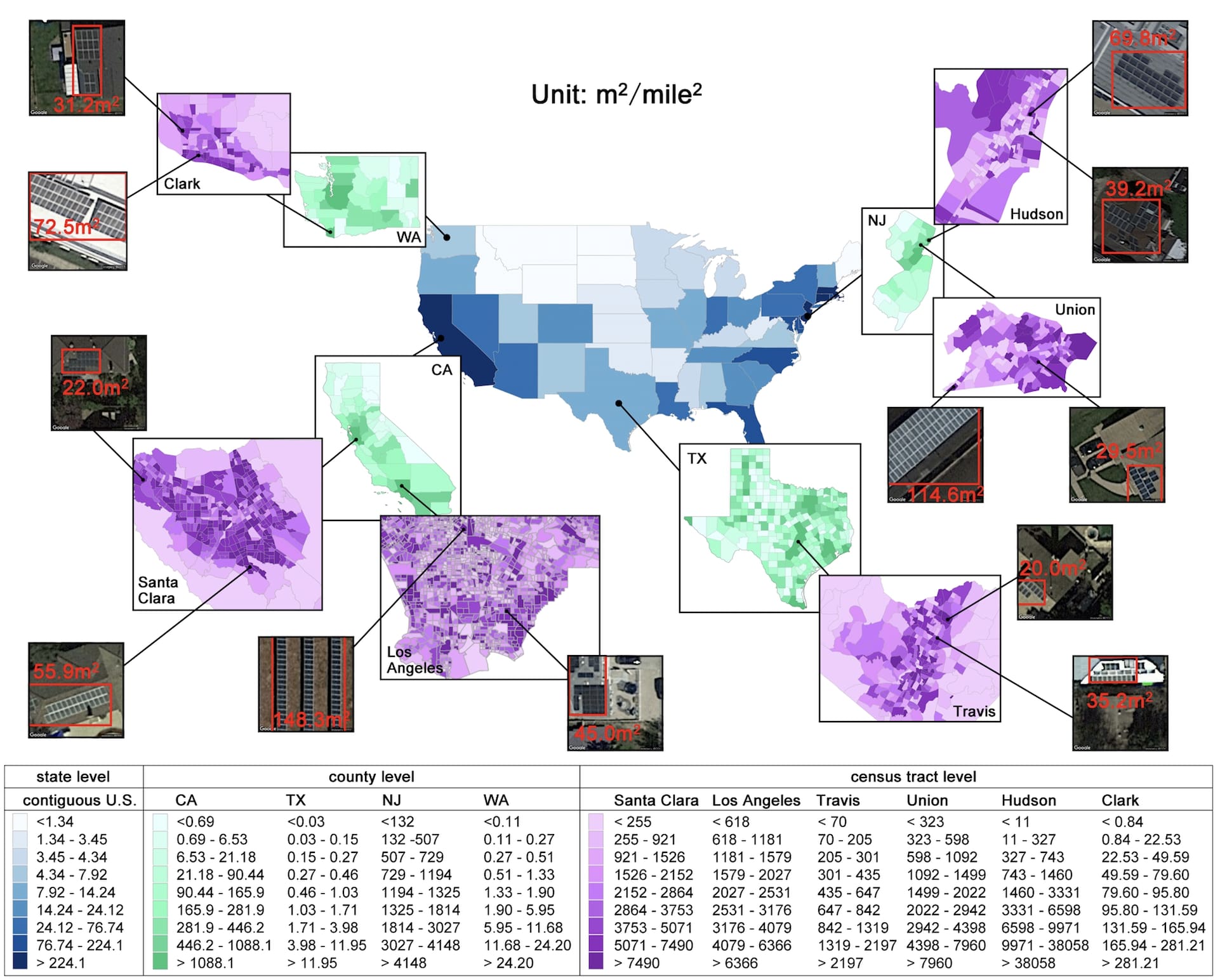 DeepSolar is a deep learning framework that analyzes satellite imagery to identify the GPS locations and sizes of solar photovoltaic (PV) panels. Leveraging its high accuracy and scalability, DeepSolar constructed a comprehensive high-fidelity solar deployment database for the contiguous U.S.