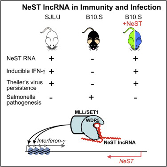 cDNA sequencing analysis suggests that at least 10,000 long non-coding RNAs (lncRNAs) are produced from the intergenic regions of the human chromosome. Only a handful of these lncRNAs have been characterized to date; the NeST RNA was the first to be linked with an immune phenotype. NeST was discovered as the genetic basis of a susceptibility locus originally mapped by its effects of the multigenic control to viral and bacterial infections. It is highly polymorphic in laboratory inbred mouse strains suggesting it has been under purifying selection by challenges to the immune response. In humans, the NeST-encoding regions are the site of disease-associated alleles for various immunological diseases that include Rheumatoid arthritis, asthma and inflammatory bowl disease. NeST expression has been observed in CD4+ Th1 cells, CD8+ T cells, and NK cells and is protective to systemic bacterial infections. It functions in the induction of IFNγ in T cells through its effects on chromatin methylation. The mechanisms that lead to the control of inflammatory microbial challenges by NeST RNA are a major focus in our laboratory.