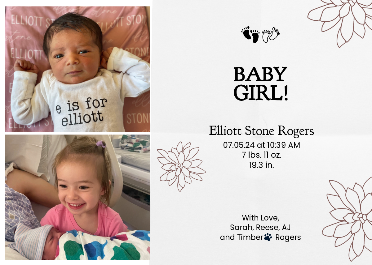 07/05/2024: Congrats to Sarah Stone and AJ Rogers on the birth of baby Elliott!