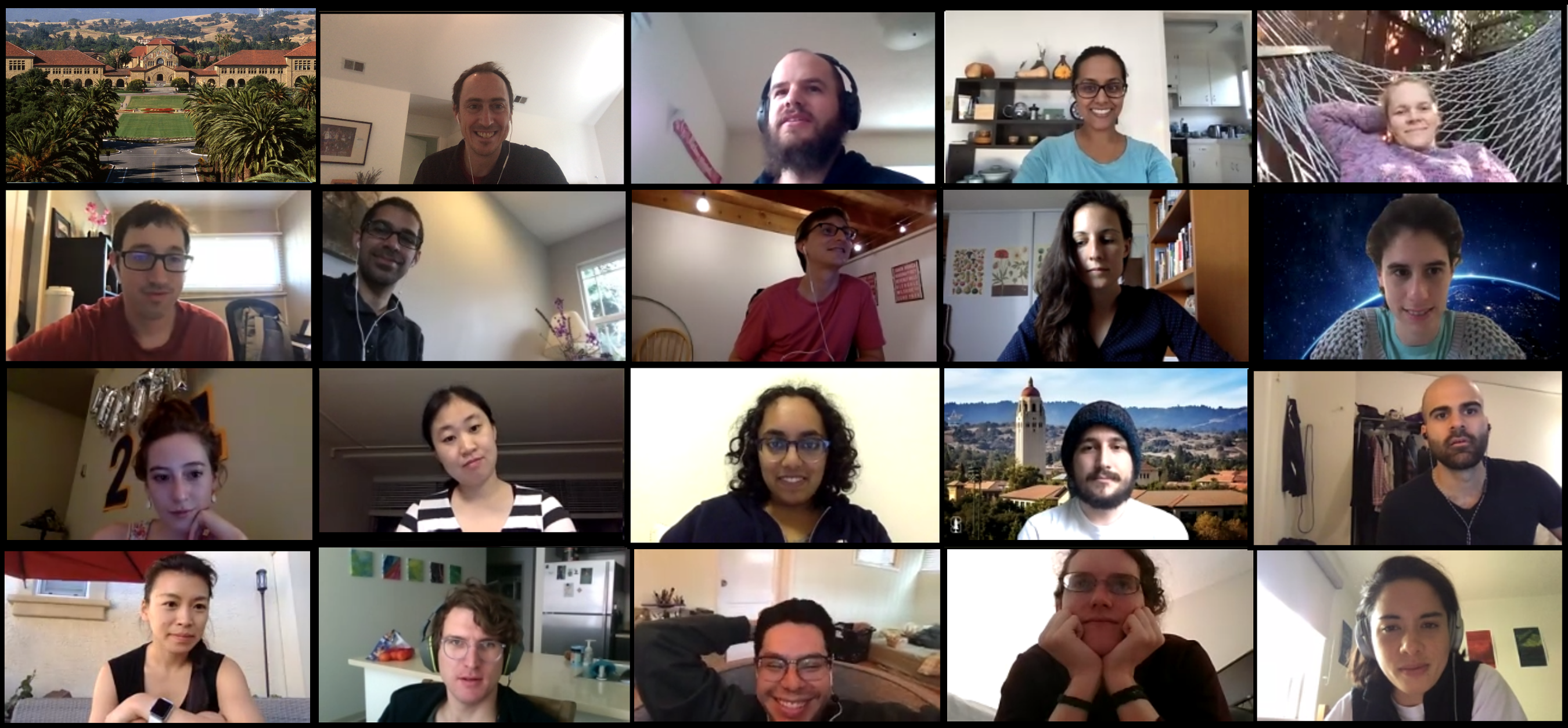 The Pritchard lab in Exile (2020 Pandemic) Row 1: Our dear Stanford campus, Jonathan, Clemens, Shaila, Hanna O Row 2: Yuval, Hakhamanesh, Jake, Hannah M, Daphna; Row 3: Alyssa Lyn, Ziyue, Roshni, Matt, Sahin; Row 4: Adele, Jeff, Harold, Nasa, Margaret. |