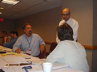 Greg McGrew, Glenn Hedman, and Cathy Bodine confer in the Board Meeting.