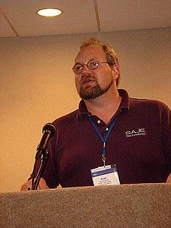 A presenter from SAJE takes the podium at the Developers Forum.