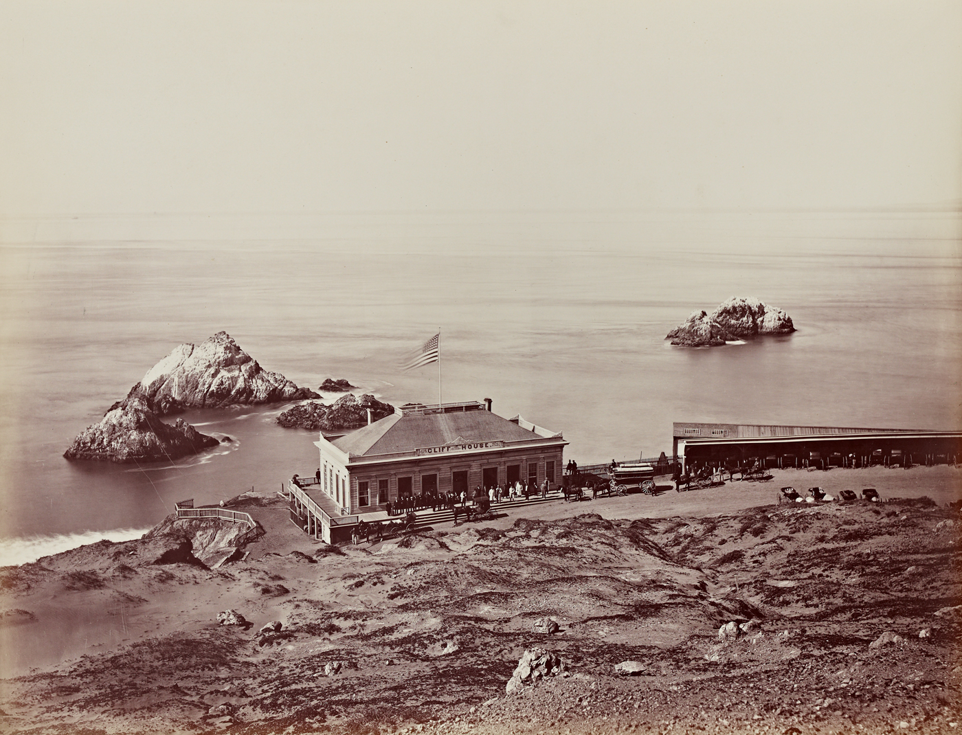Of all the Watkins photographs we restaged, we experienced the greatest change in the landscape in the view of Alcatraz Island from North Point. Although you can see the shape of Angel Island in both pictures, the profile of Alcatraz is markedly different. In order to see the island and its famous prison building clearly, we had to place the camera at the end of Pier 39, which opened only in 1978, half a mile further into the bay than the historic North Point where Watkins took his picture.