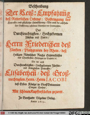 1 Beschreibung Der Reiß: Empfahun[n]g deß Ritterlichen Ordens: Vollbringung des Heyraths: vnd glücklicher Heimführung: Wie auch der ansehnlichen Einführung: gehaltener Ritterspiel vnd Frewdenfests: Des ... Herrn Friederichen deß Fünften/ Pfaltzgraven bey Rhein ... Mit der ... Princessin/ Elisabethen[n]/ deß Großmechtigsten Herrn/ Herrn Iacobi deß Ersten Königs in GroßBritannien Einigen Tochter?: Mit schönen Kupfferstücken gezieret, [Electronic ed.] ([Heidelberg]: Vögelin, 1613). Accessed January 12, 2010. http://diglib.hab.de/drucke/197-15-hist/start.htm.