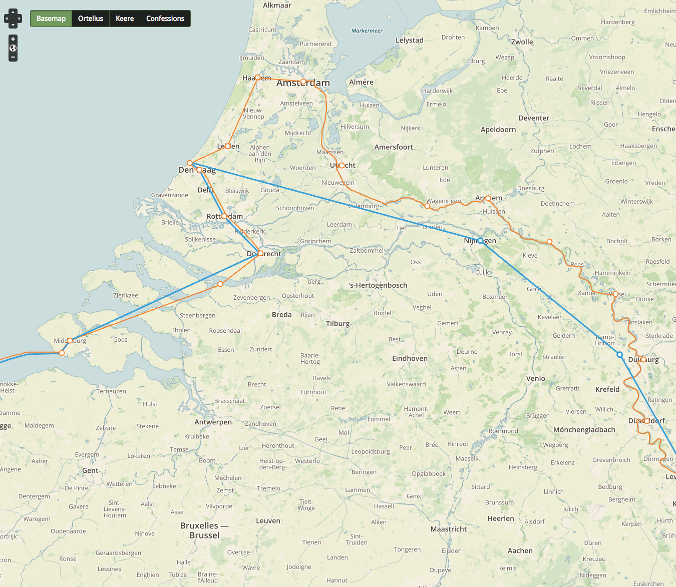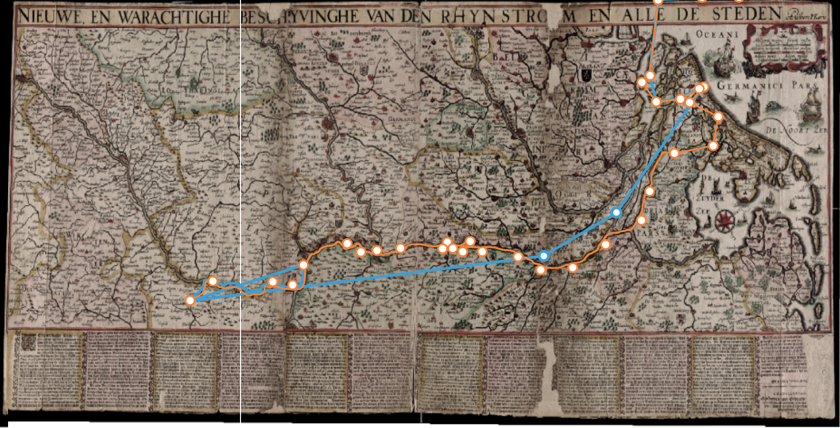 2 Thanks to dilibri Rheinland-Pfalz for providing the high-resolution digital version of this map. Pieter van den Keere, “Nieuwe, En Warachtighe Beschryvinghe Von Den Rhyn Strohm En Alle De Steden/ Aucthore: P. Kaerio,” Rheinische Landesbibliothek Koblenz, dilibri Rheinland-Pfalz (Amsterdam, 1621), http://www.dilibri.de/152313. This edition is the second printing of this single-sheet map. Günther Schilder, Monumenta Cartographica Neerlandica (Alphen aan der Rihn: Uitgeverij Canaletto Repro/Holland, 2007), 8:551. Classification 42.1a. Thanks to Stanford University Special Collections for the use of Abraham Ortelius and Francis Hogenberg, “Germaniae Typus,” in Theatrum Orbis Terrarum (Antuerpiae: Ex Officina Plantiniana, Abrah. Ortelij aere & cura, 1595), Stanford University Special Collections.