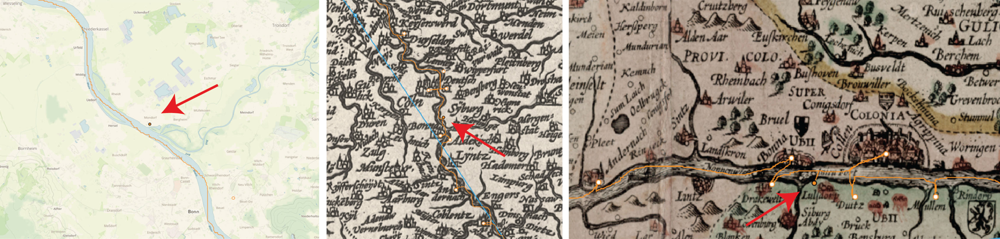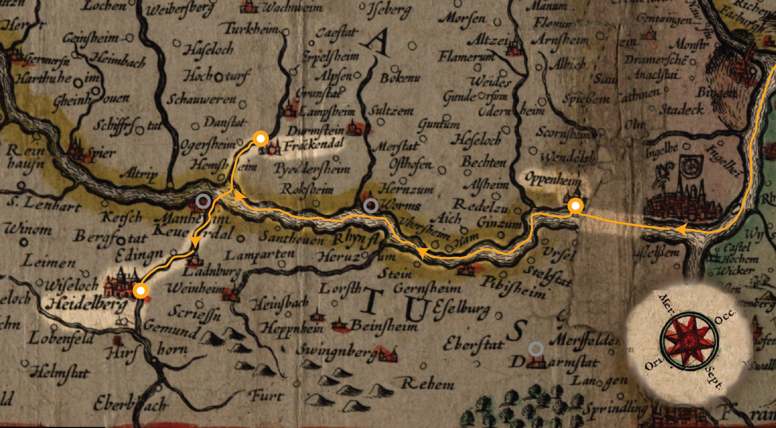 4 The strategic value of Mondorf at the confluence of the Stieg and Rhine rivers is also apparent in this map: a fort was built on the island Kemper Werth in 1620, shortly after the outbreak of the Thirty Years War. Van den Keere’s 1621 map is the first to depict this “tneieu Fort,” which changed hands multiple times during the course of the war.