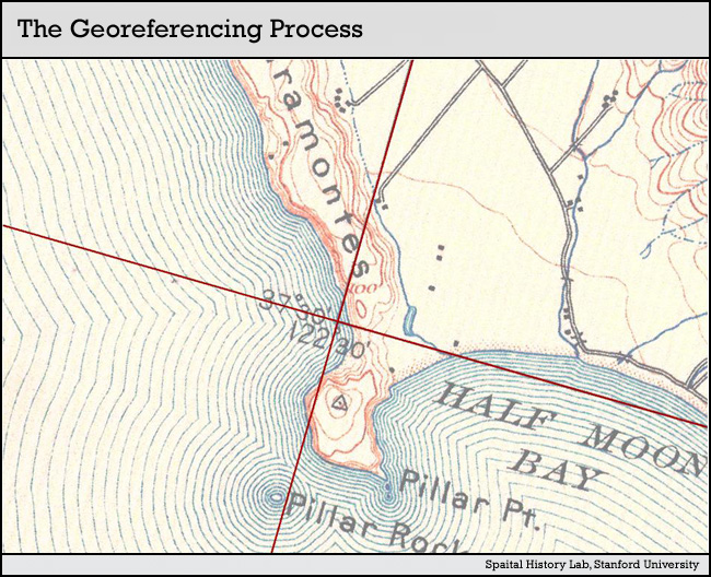 5 Georeferencing in ArcGIS places the maps into their digital geographic locations. This process is essentially the same as a Google Maps team placing street-view photos into their digital geographic locations according to building and street coordinates.