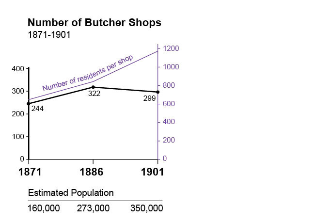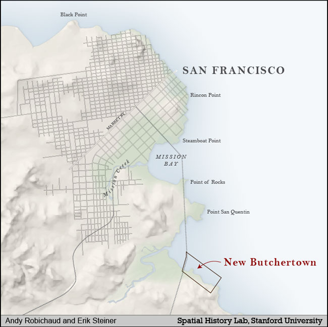 29 On a separate note, butcher shops might stand as a highly accurate proxy for settlement, since people did not travel far to buy meat. Since we do not yet have mapped population data for San Francisco in the nineteenth century, butcher shops may offer a decent place marker.