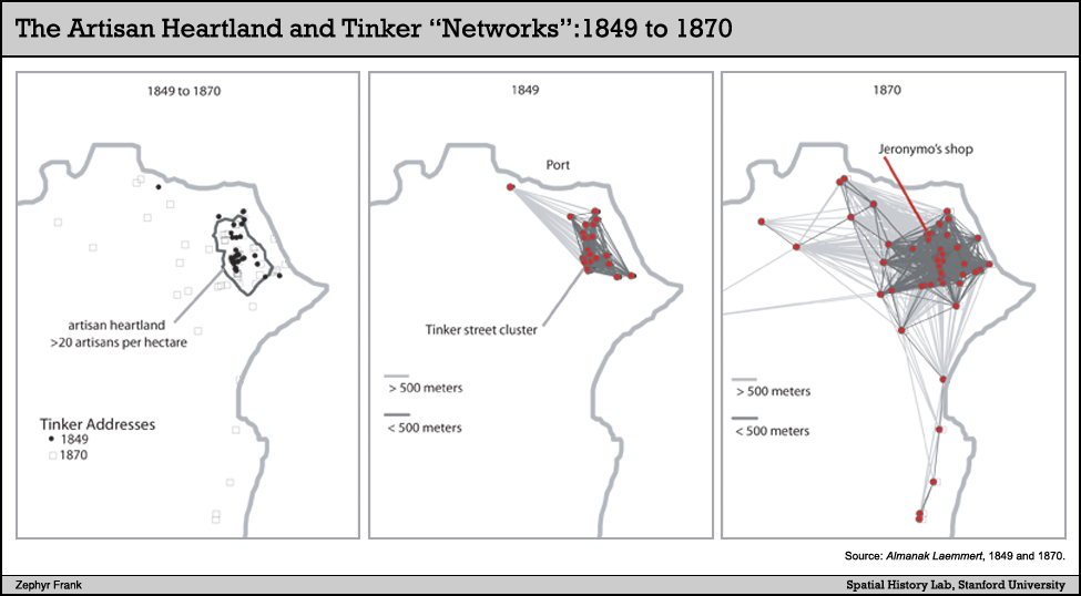 Source: Almanak Laemmert, 1849 and 1870. Networks drawn with ArcGIS network analyst, measuring by Manhattan (street) distance.Published in: Frank, Zephyr. "Layers, Flows and Intersections: Jeronymo José de Mello and Artisan Life in Rio de Janeiro, 1840s-1880s." Journal of Social History (winter 2007): 313.
