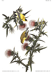 | Audubon shows these birds foraging upside-down on Bull Thistle (Cirsium vulgare) an invasive here that provides food as well as down used to line its nest (which is so water-tight nestlings can drown during storms). Goldfinches breed late in the season, timed to the availability of thistle seeds.