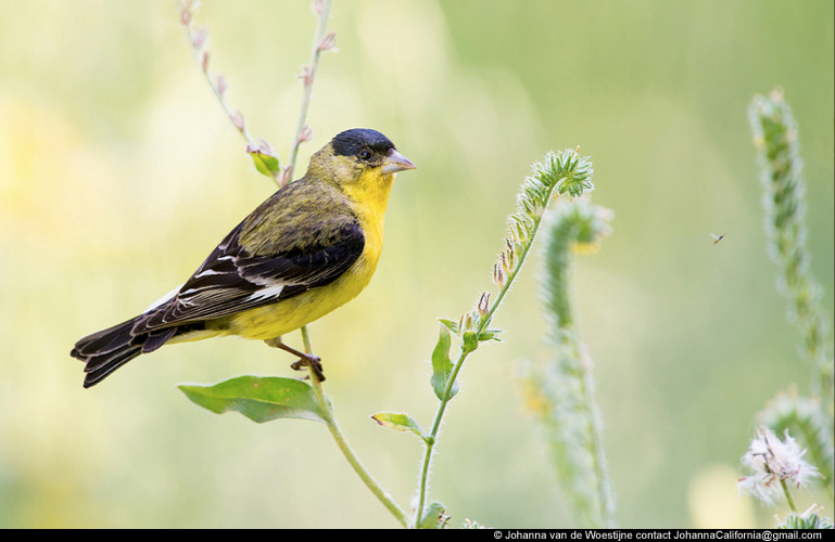 | Johanna van de Woestijne's photo of an American Goldfinch from Shoreline Mountain View, CA, at some distance, shows the “weedy” mustard habitat