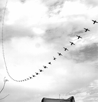 Audubon shows four males and a nesting female. Note the fanned tail of the upper left male and consider the idea that the two outer feathers are capable of producing a loud chirping sound. Here's how it works: In its 12-second aerial display, the male climbs 100', takes a J-shaped dive, swooping down and then, while curving upward to form the bottom of the "J", fans its tail for 60 milliseconds, as seen in the photo. At that point, a 50-mph air stream forces the inner vanes of the two outer tail feathers to vibrate like the reed of a woodwind instrument, and the bird quickly “plays” a very loud, “chirp.” For more, see Science, below. |
