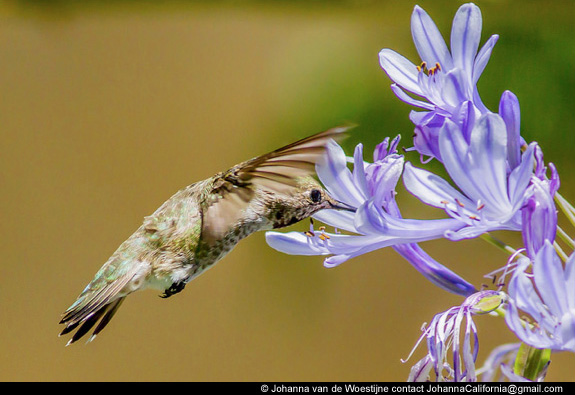 | Johanna van de Woestijne's photo of an Immature Anna’s Hummingbird shows perching rather than hovering while feeding in rurban native plantings near campus. This female Anna’s Hummingbird is gathering webs to use as nesting material--Palo Alto Baylands, CA. This Anna's Hummingbird foraging on Agapanthus shows the potential role of these birds as pollinators. See more of Johanna's photographs. |