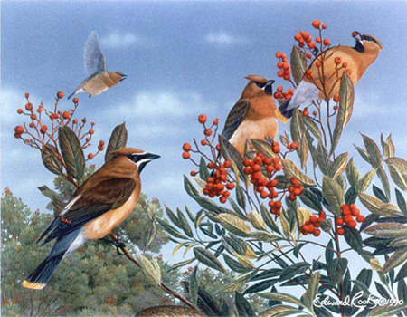 Named the "Chatterers of Carolina" by Catesby in 1731, the "Silk-tail of the Cedars" by Viellot in 1807,and finally the "Waxwing" in 1817, these highly vocal, opportunistic, and irruptive birds, often form large autumn and winter flocks. The highly social aggregations apparently enhance foraging and protection. The waxy red wing tips may serve as badges indicating age or foraging success (measured by fruit-derived red pigment sequestered in the wax), because not all have them, and of those that do, not all are equally endowed.