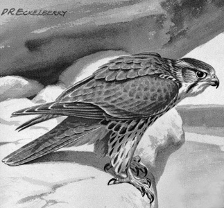 The Prairie Falcon (shown here in black-and-white) is smaller, more slender and more maneuverable in flight than the Peregrine Falcon, but less adapt as a hunter, specializing on prey usually caught near the ground.