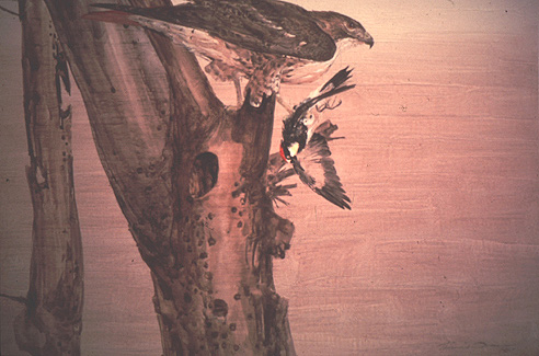 While Red-tailed Hawks rely on rodents for more than 85 percent of their diet, they supplement it with birds, reptiles and insects. And, while Acorn Woodpeckers actively defend acorn caches from raiding squirrels, jays, titmice, etc., (which also store acorns) they are at risk to predation.