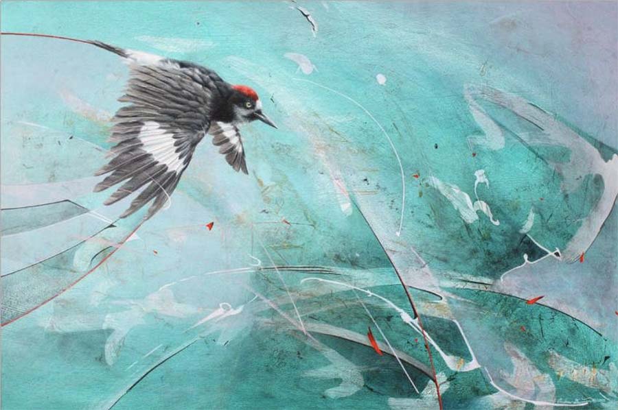 Science Art note: Andrew Denman beautifully aludes to the distinctive swooping flight of these birds. Their call is distintive, as well. Here's a nice video providing both, along with activity at a grannery tree. |