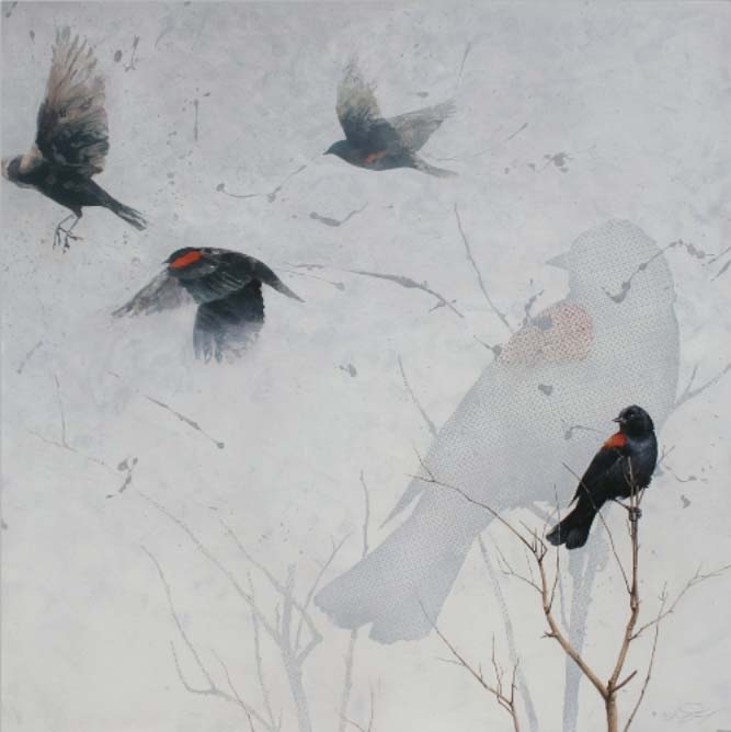 Artist's comment: "The large, repeated silhouette of the foreground bird speaks to my current interest in both pattern and repetition. The improvisational treatment of the birds in flight and the Jackson Pollock-like splatters create a sense of movement, a difficult task within a square format that usually would lend itself more to a static image than a narrative. The deliberately awkward (dare I say “Degas-esque”?) cropping of the female bird in flight contributes to this sense of sudden motion. The careful balance of positive and negative space, much like the actual birds’ song in flight, takes on a musical quality that gives the painting its title, Staccato. |