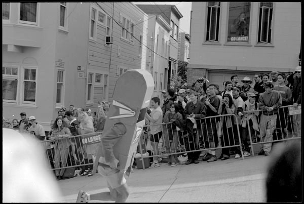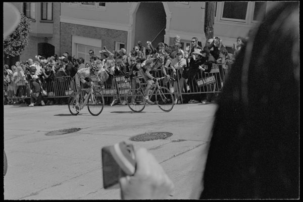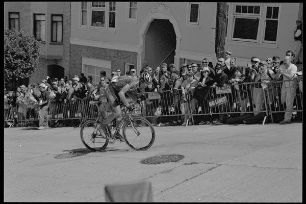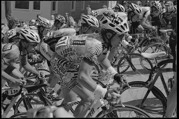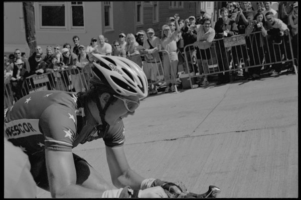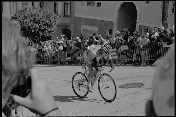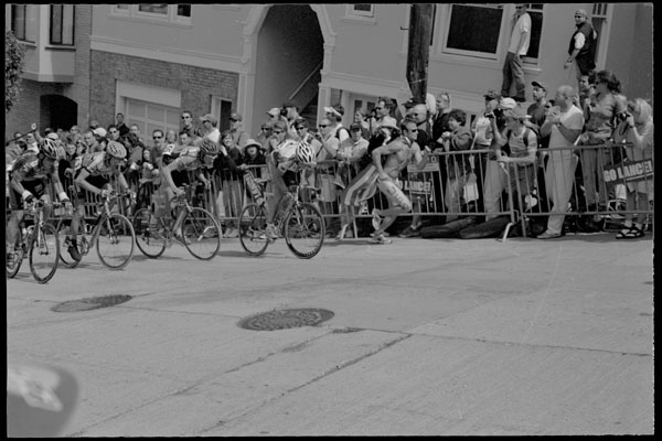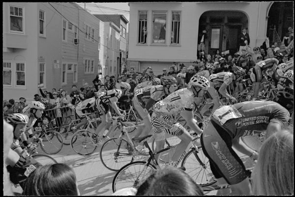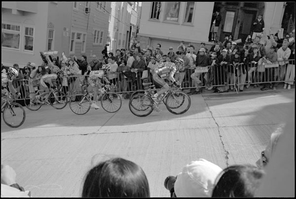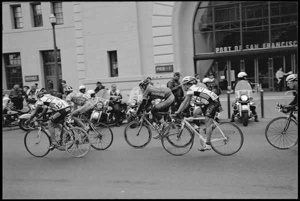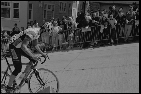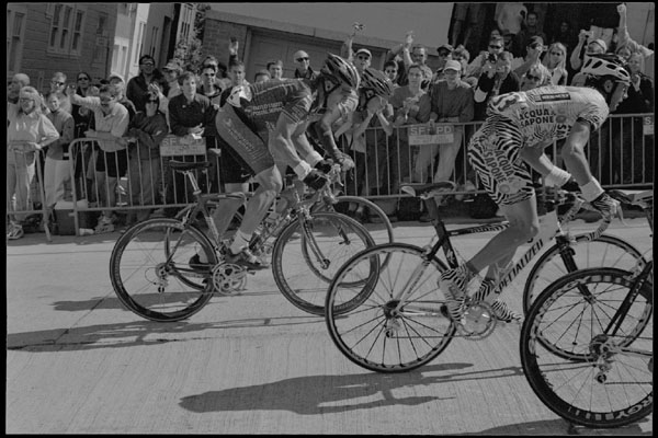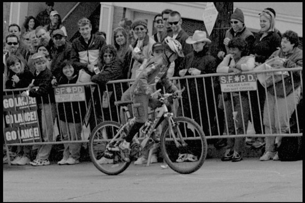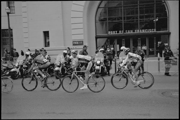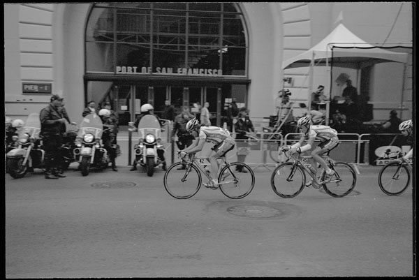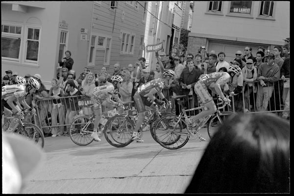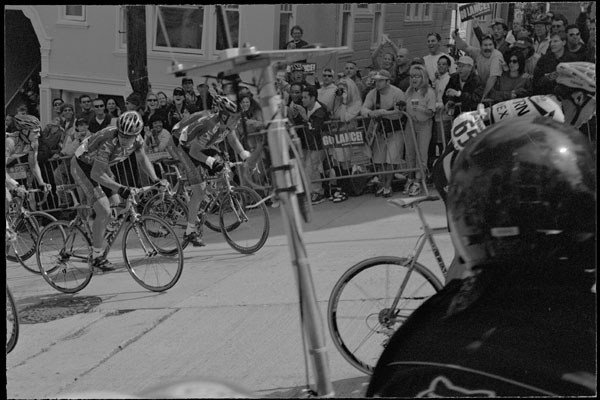 After two SF Grand Prixes and 8 rolls of film, I finally get a decent picture of Lance! Here's a larger version. With him are Massimo Giunti (33) and another rider that I can't identify. |
