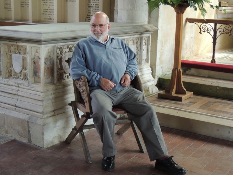 Eastling201307 -- Don tryng out the Bishop's chair at Throwley Church