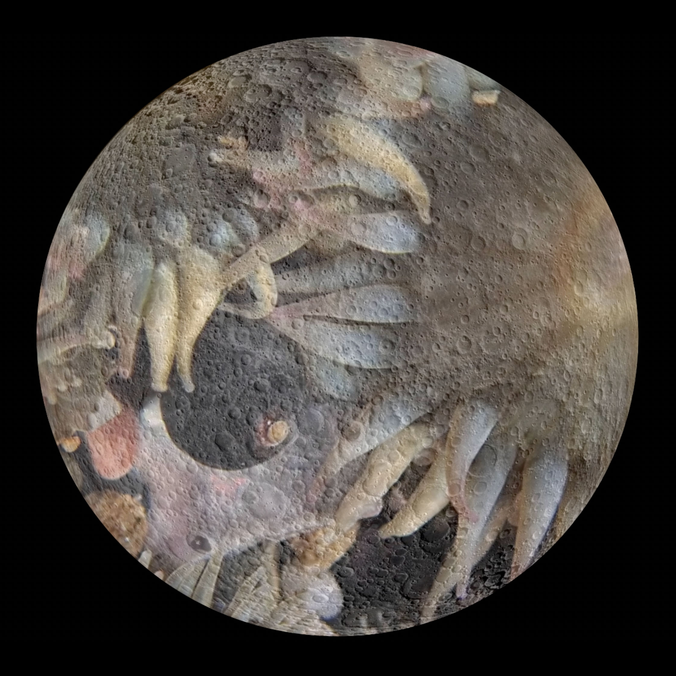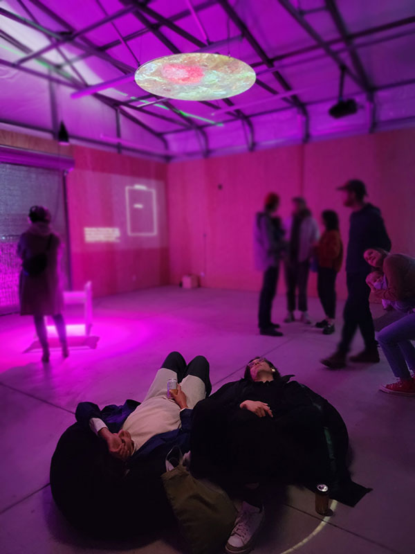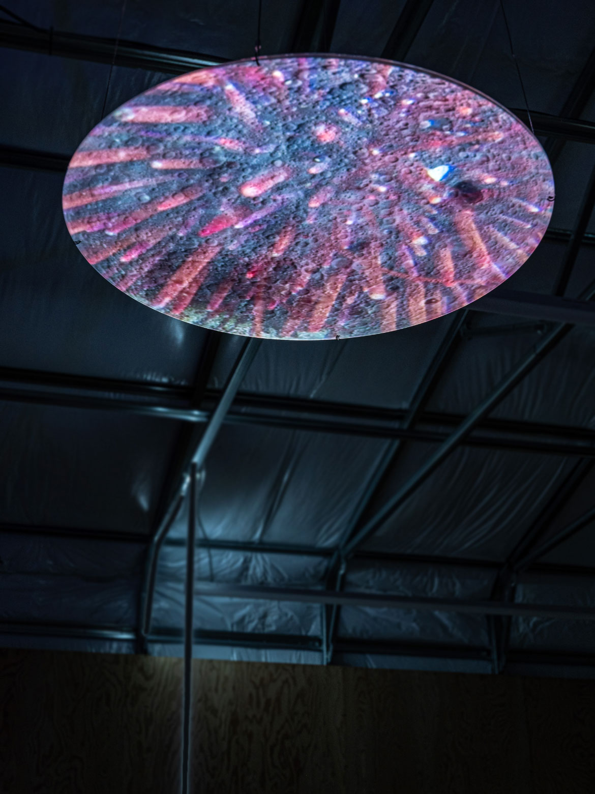 Blue Lunar Eclipse is comprised of footage from tide pools superimposed on the dark side of the moon. Visitors lie on cushions and gaze up at the moon, which is alive with undersea exuberance.