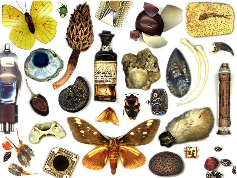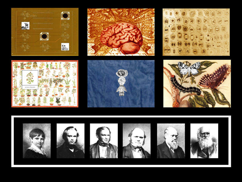 Based on 17th century precursors to natural history museums, each object in this cabinet of curiosities leads to a small time-based meditation on the nature of evolutionary science. Images show the main screen, the interactive cabinet, and a composite image showing details from seven different stories.