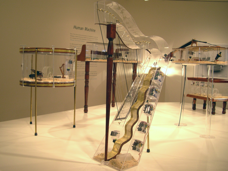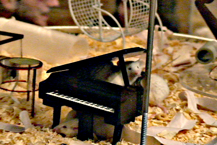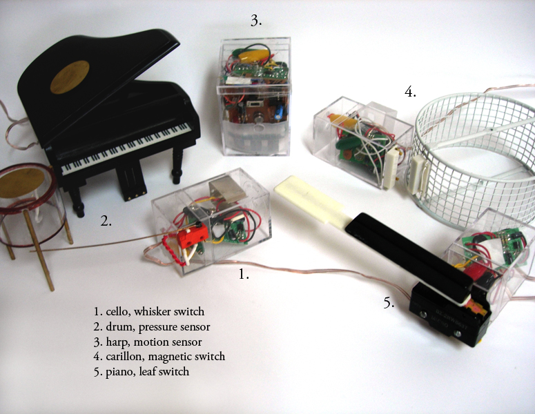 A piano, carillon, drum, harp and cello, partially rebuilt in plexiglas, and played by mice. Switches play musical phrases when triggered, as the mice explore the instruments. Commissioned by Cornerhouse, Manchester for Wonderful. Funded by NESTA, Wellcome Trust, & Arts Council of England.