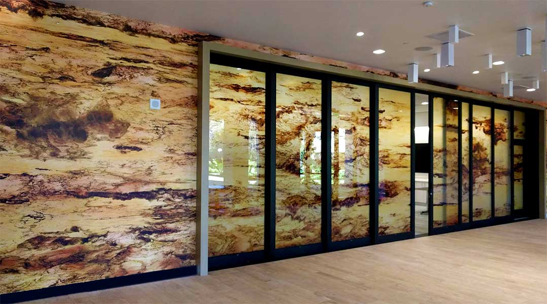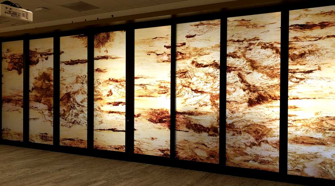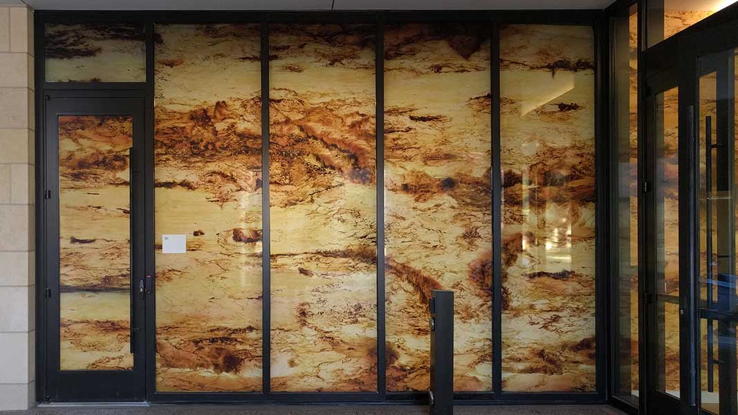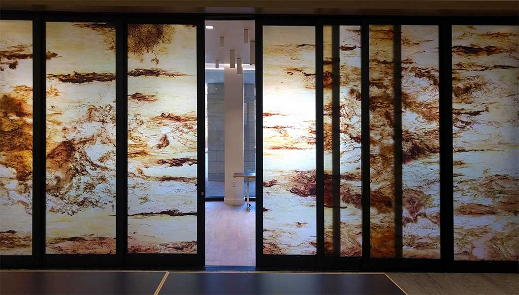 This 60' long undulating landscape began with 2485 photos of the Pacific Ocean. A permanent installation in Stanford’s new Bass Biology Building, the composited image teeters between ocean and desert, spilling from outside into the interior, across glass and solid walls and movable glass doors.