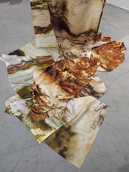 High resolution images of the Pacific Ocean are composited, creating continuous landscapes reminiscent of literati paintings. They're printed on silk charmeuse, allowing the prints to fall and pool on the floor. Three prints are color reversed, each representing a season of the Pacific Ocean: Winter Storms, Upwelling, and Oceanic. Another is a deep inky blue, comprised of composited details of crashing waves.