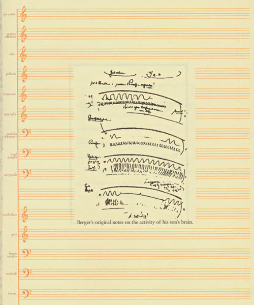 The first human encephalogram ever recorded, along with sample EEGs, are played by classical synthesized instruments. Sheet music recounts the history of EEGs and their implications for shaping thoughts.