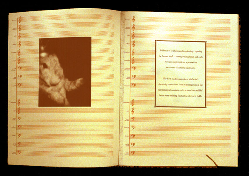 encephalograms, audio generated by EEGs, digital prints and text, music stand