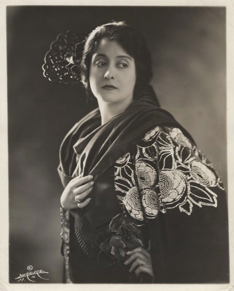 I had assumed this was a portrait in costume from Enter Madame (1922) because the dress looks like the one in a still from the film. However, another picture from this Witzel photo session appeared in the Wid's Yearbook 1919-1920, and Randy Bigham has identified the gown as a Lucile design first seen in The Road though the Dark in 1918, as seen here | |