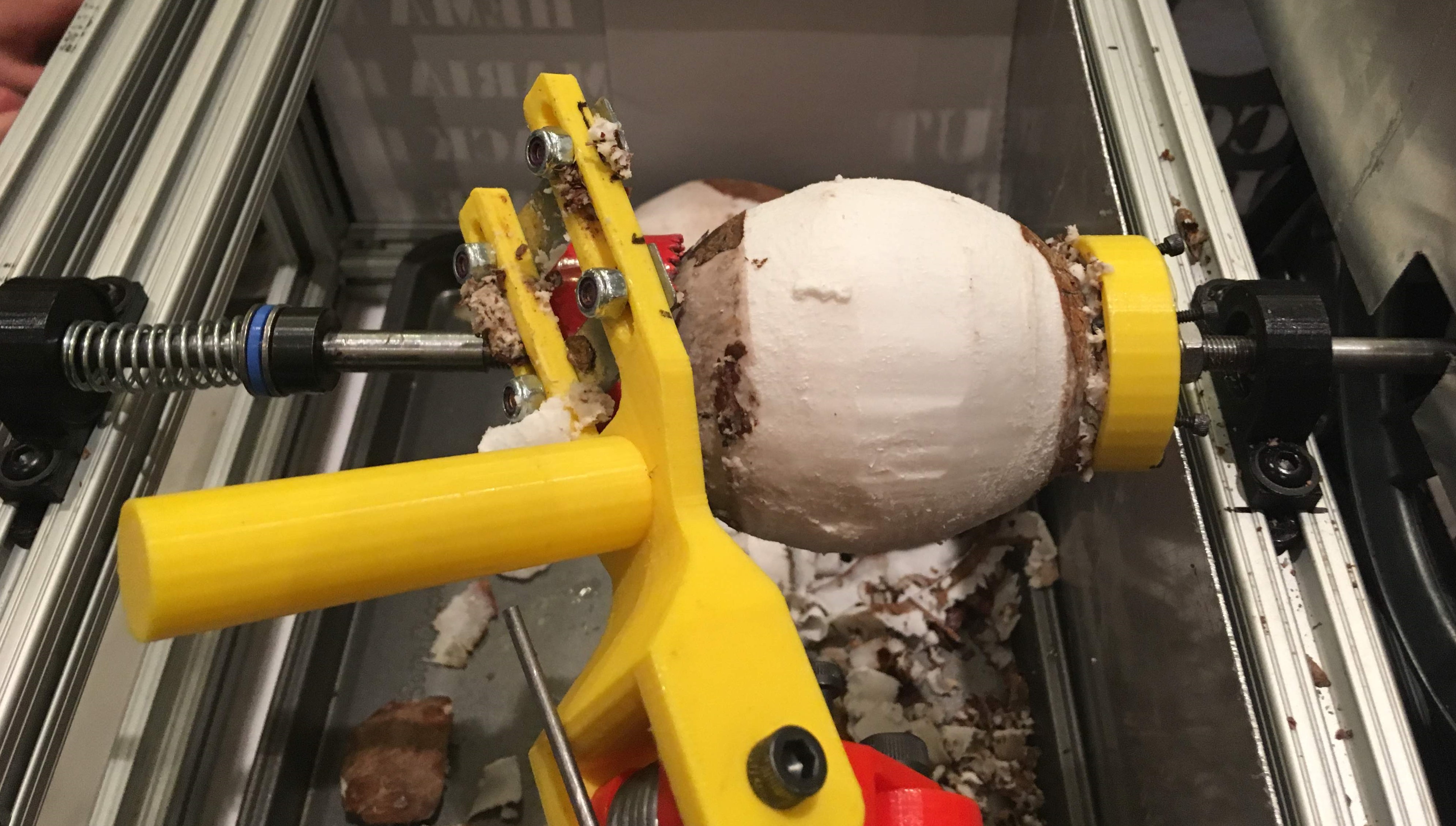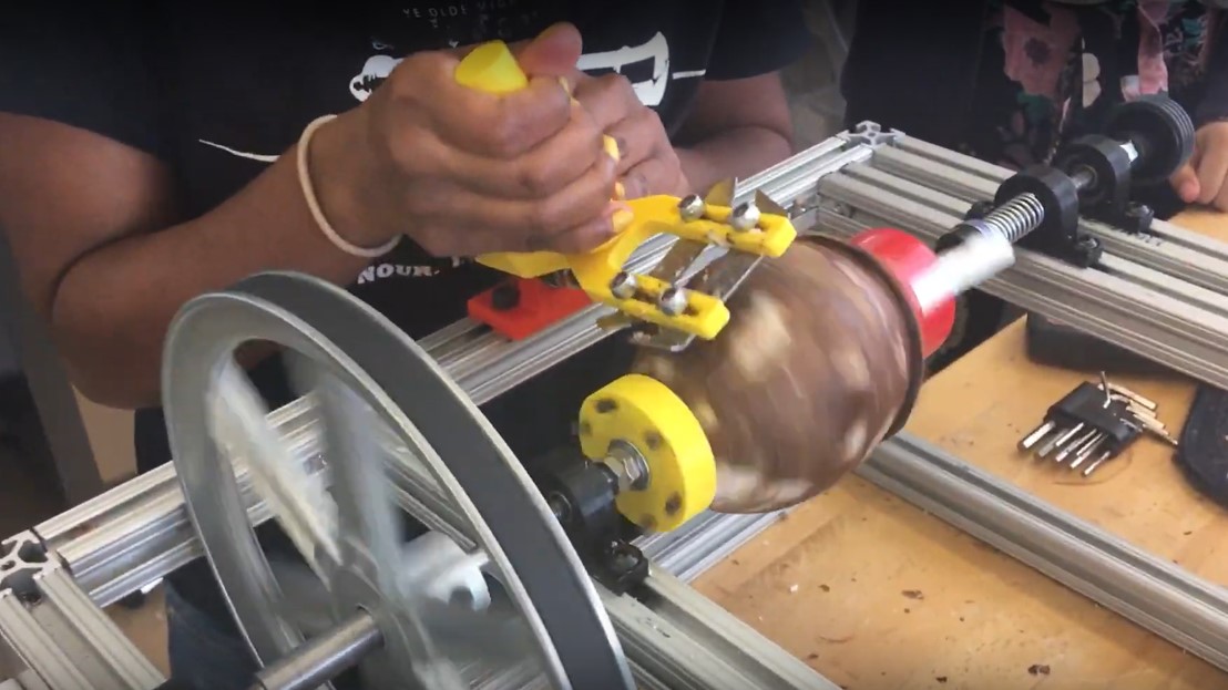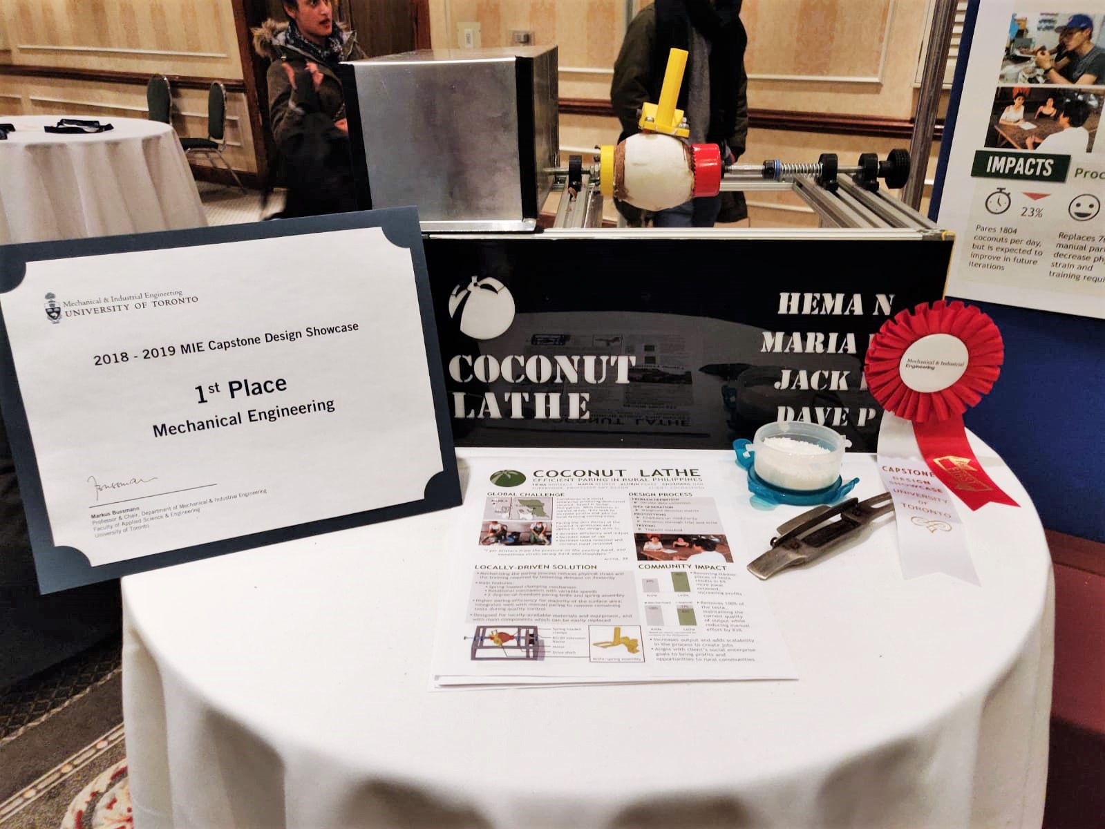 After travelling to the factory for on-site data collection, my team designed and prototyped a peeling machine and a flexible, 3-DOF knife-holding mechanism using locally available materials and manufacturing equipment. The prototype reduces manual effort required for peeling by 76%, and lowers the amount of coconut meat wasted in the process by 5%. Our design was awarded 1st place in the Mechanical Engineering Capstone Showcase, along with a $1000 prize.