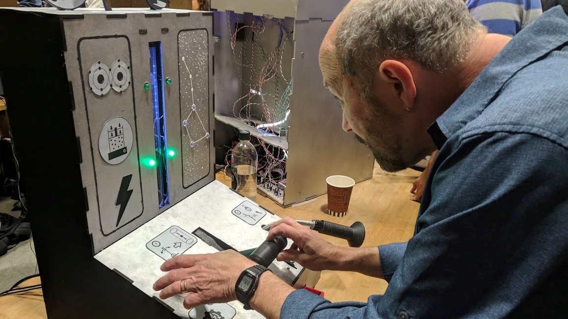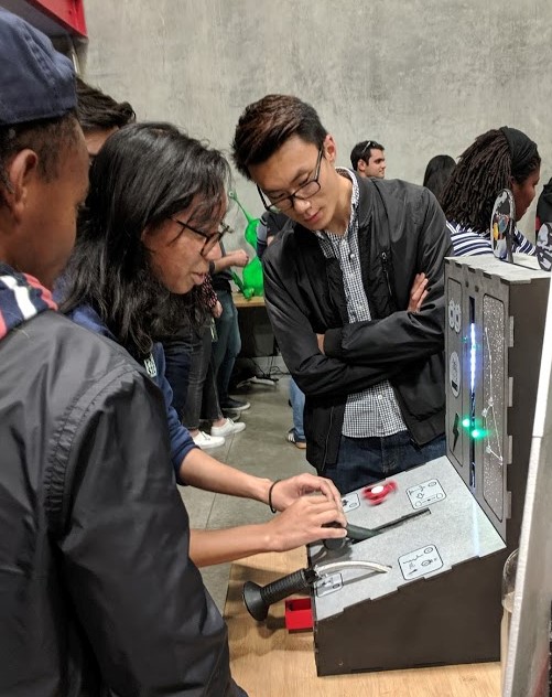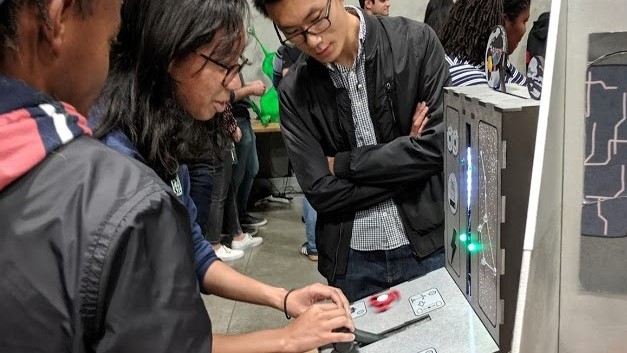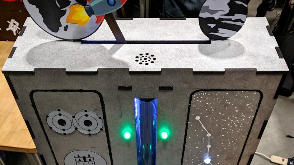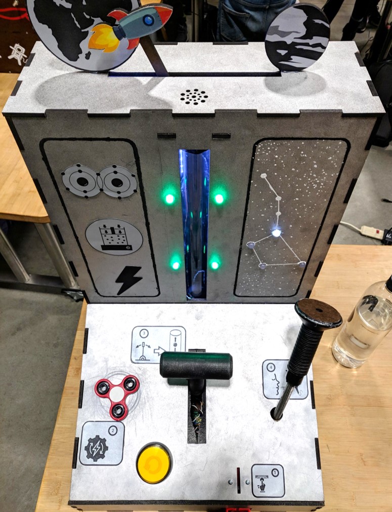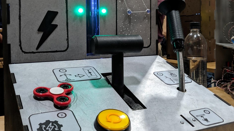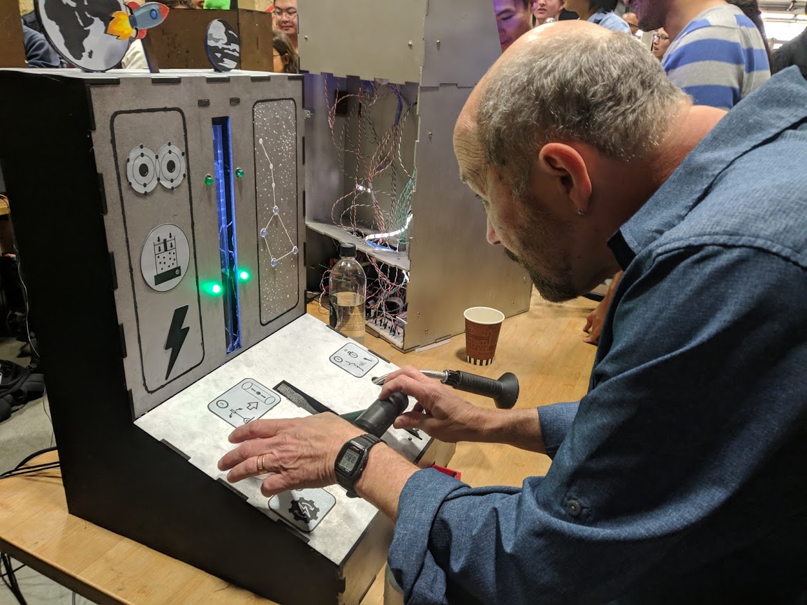 Simple arcade game which senses user inputs through a button, coin sensor, microphone, rotary potentiometer, and Hall-Effect sensor. Users must levitate a pingpong ball along a vertical column by controlling power output of a fan using a lever. Then, they must continuously blow air into a microphone to light LEDs in sequence in the shape of a constellation. The game incorporates non-contact sensing, large-scale motion, and auditory feedback. It was displayed at the ME218A project showcase to the public.