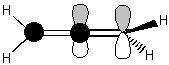 One of the reasons allene is so popular in this class is that it is not only interesting from a group theoretical perspective, but also from a bonding perspective. The central carbon is sp hybridized. Its two unhybridized p orbitals are required by quantum mechanical laws to be perpendicular to the sp hybrid orbitals and to each other. The consequence is that the sp hybrid orbitals on the central carbon form sigma bonds with the two outer carbons, one pi bond is formed in the plane of the page, and the other pi bond is perpendicular to the plane of the page. Below is a projection down the carbon-carbon-carbon bonds of allene and a picture of the p orbitals that are involved in its bonding scheme. Notice that you can only see the tops of the p orbitals on the left; they are coming out of the page. This type of system, in which two adjacent pi bonds are formed from perpendicular sets of orbitals, is called a cumulated system and is somewhat unstable (although allenes are found in nature). Later we will contrast such systems with their more stable, conjugated counterparts.