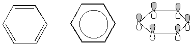 Below are some alternative representations of benzene. The last one shows the p orbitals making up benzene's conjugated system. (A conjugated system is a system in which there are alternating double and single bonds. Recall that a cumulated system, like allene, has adjacent double bonds. Conjugated systems are very stable while cumulated systems are somewhat unstable for reasons that we will study soon in the organic chemistry section.)