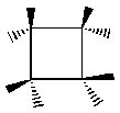 Note that in these interactive figures, the bonds are not shown. Only the atoms are there. I have colored carbon red and hydrogen blue for your viewing pleasure. You should learn to recognize the different ways that chemists represent three-dimensional structures on two-dimensional paper. Here is a drawing of cyclobutane as a chemist might sketch it. Notice that the bold lines indicate bonds that come out of the page and the dashed lined indicate bonds that go into the page. This shows that the four carbon atoms approximately define a plane; the hydrogens are on either side of the plane. Even though carbons are singly-bonded to each other, there is not free rotation about this carbon-carbon bond because there isn't room for the hydrogens to squeeze past each other though the ring.