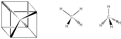Here are some alternate representations of methane. The first shows explicitly that the four lobes of the tetrahedron point toward the corners of a cube. The other two use the conventions that bold means out of the page and dashed means into the page. The drawing to the far right has one of the C3 axes of methane in the plane of the page.