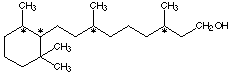 4.* (1996 F 5) Vitamin A or retinol is an essential component for the vision receptors in the eyes. Its structure is shown below. Reaction of Vitamin A with H2 over Pd/C produces a substance whose molecular formula is C20H40O. This substance appeared impure; for example it showed a wide melting range and several bands on a chromatographic column. Explain the nature of this new material and comment on its optical activity.