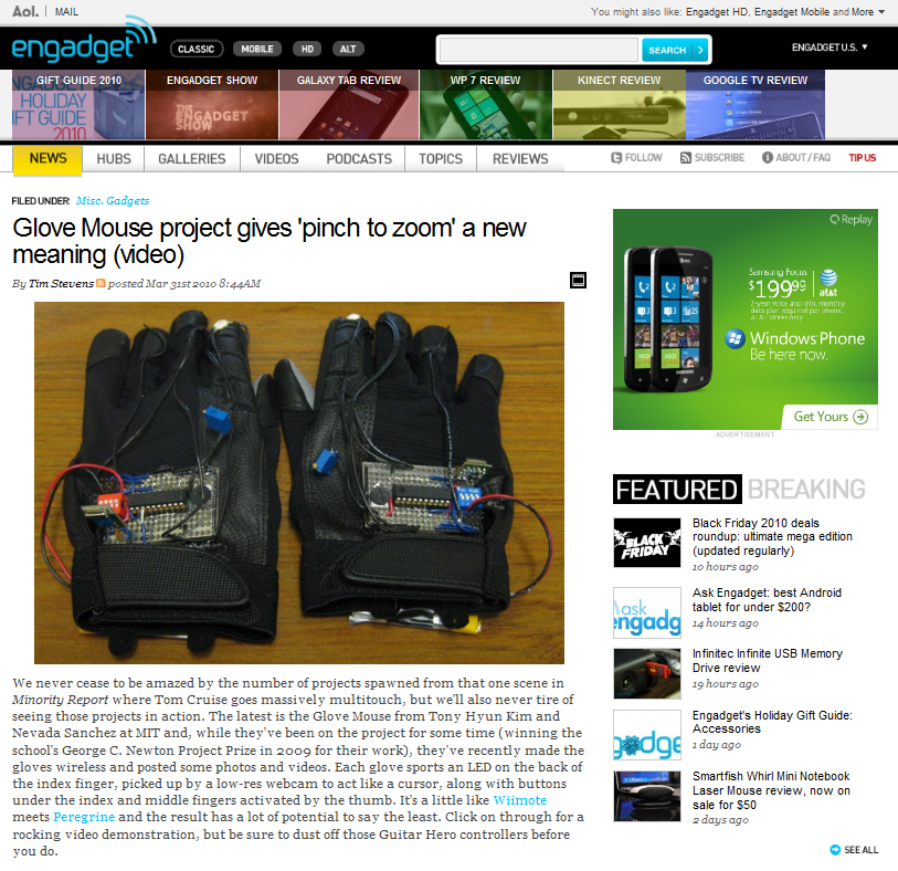 The Glove Mouse is a former 6.111 [digital electronics lab] project by Tony Hyun Kim (EECS '09) and Nevada Sanchez (EECS '10), in which we demonstrated intuitive control of a map application using only one's hands.
