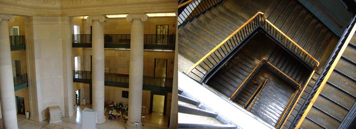 The lobby of building 7 displays a similar consideration for the circulation of the community. There are a total of nine connections visible from the ground floor converging at the atrium of the structure, with each set of three stacked on top of the other. Such a vertical stack maximizes the amount of traffic that can flow in a limited space. And according to Banham, Sant’Elia seems to have anticipated this solution as well, as he utilized in some drawings “as much as seven levels [of complex network of transport services]” [7] beneath the ground floor to achieve maximum output.