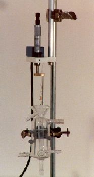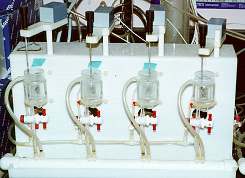This custom glassware was crafted at a local glassblowing shop. The micrometer on top is for greater precision in adjusting tension to the tissue suspended between a hook (bottom) and a force transducer (top). The small boxes house associated signal conditioning electronics. As the tissue contract, a 4-20mA current output is produced. Several types of hand made triangle hooks and clothespin like clips are used to attach the tissue. The stand shown on the right is made of plastic, and was designed to be easily maintained. Again, the glassware was made custom to the users specifications. In this case the working chamber is a little wider to accommodate larger tissue segments, and has approximately 25% more volume. |