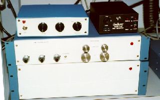 The black cylinders shown here on the left contain photomultiplier tubes (PMT's) and their electromagnetic shielding. The adjacent boxes contain current to voltage converters and preamplifiers. The gain ,or light sensitivity, of the system is controlled by adjusting the voltage applied to the PMT's in the range of 500 to 2000 Vdc. Also shown are filter wheels and associated stepper motors viewed edgewise. The rack mountable boxes on the right contain the custom circuitry for signal filtering & amplification, PMT voltage adjustment and filter wheel indexing. The bottom box is a power supply and computer interface for commercial galvo laser scanners typically used in confocal and 2-photon microscopes. |