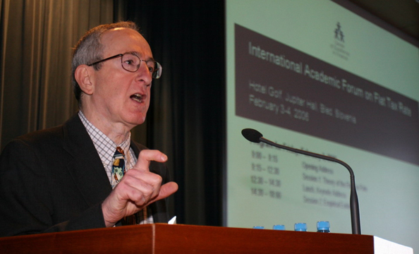 Alvin Rabushka speaking on the flat tax at a forum on the flat-rate tax sponsored by the Center for Excellence in Finance in Bled, Slovenia, February 3, 2006 |